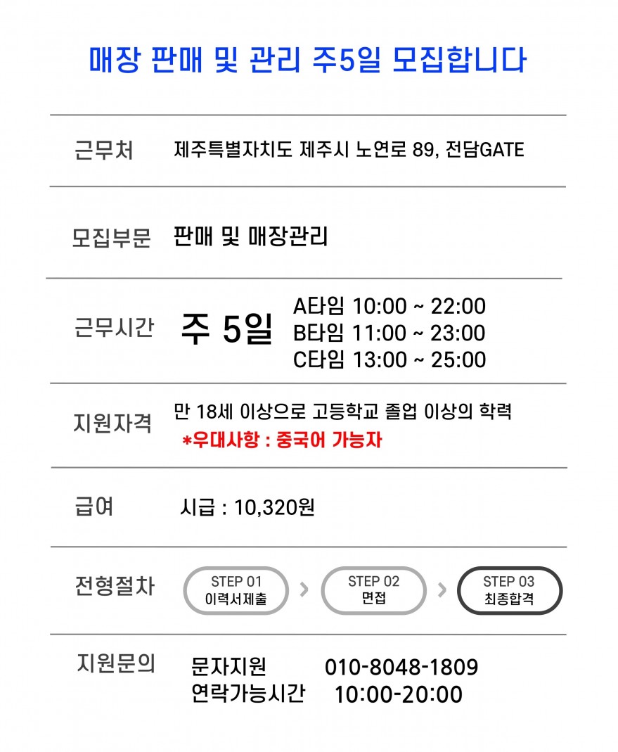 ★★★세상에서 제일 쉬운 판매직 직원을 모집합니다(주5일)★★★ 페이지 정보 작성자 곽O식 작성일25-12-15 17:56 조회36회 연락처 010-8048-1809 급여 시급 : 10,320 관련링크 본문 ■ 주업무 : 고객이 물건 선택하면 결제 후 봉투에 담아드리기.외워야 할 내용 거의 없음.■ 근무지 : 연동 주소 : 제주특별자치도 제주시 노연로 89 1층 전담GATE 이전글 다음글 목록