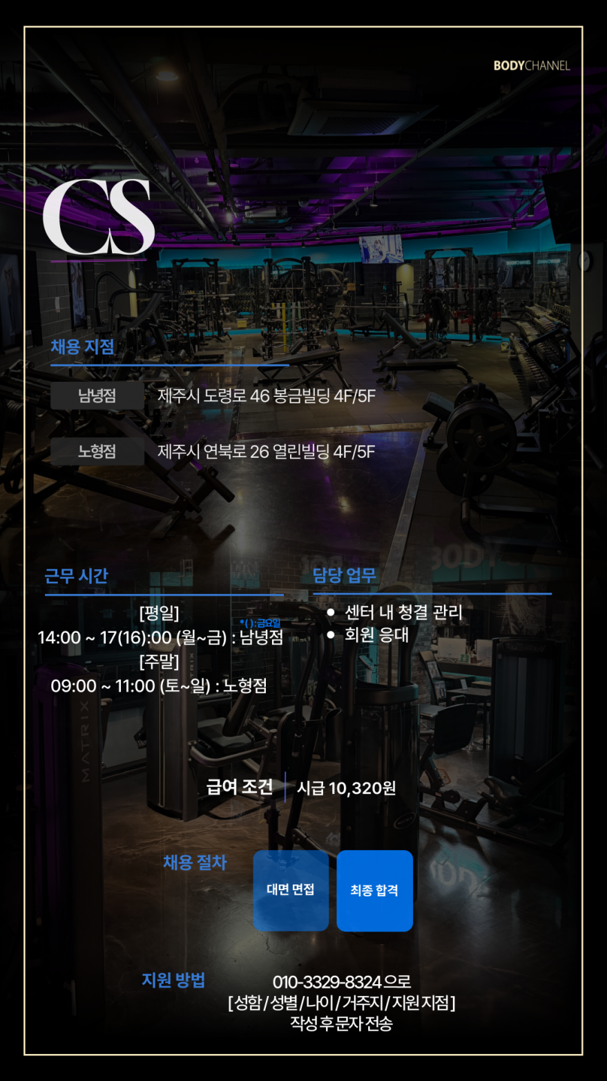 바디채널 제주지점 (남녕점, 시청점, 노형점)에서 FC / CS 를 맡아주실 직원분들을 구인합니다.