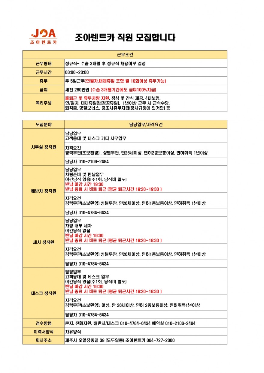 ⭐조아렌트카 / 예약실 데스크 배차 세차 / 출퇴근휴무차량지원 ໒(◉ᴥ◉)७ 페이지 정보 작성자 쎄OO어 작성일25-12-24 16:45 조회400회 연락처 010-4784-6434 급여 월급 : 280만원 관련링크 본문 주소 : 제주특별자치도 제주시 오일장중길 39 조아렌트카 이전글 다음글 목록