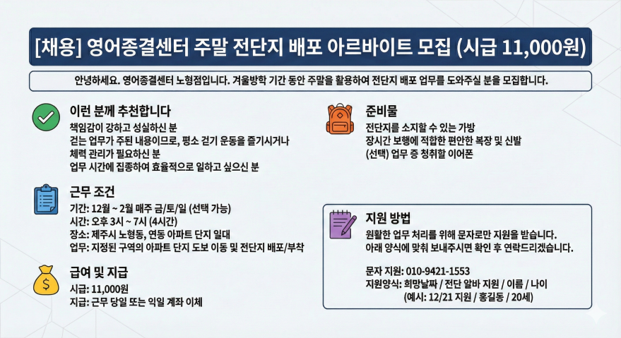 [주말 꿀알바] 영어학원 전단지 배포 알바 모집(친구랑 같이 지원!) 페이지 정보 작성자 lOOOOOe 작성일25-12-23 14:08 조회604회 연락처 010-9421-1553 급여 시급 : 11000 관련링크 본문 주소 : 제주특별자치도 제주시 월랑로 59 세흔빌딩 6층 이전글 다음글 목록