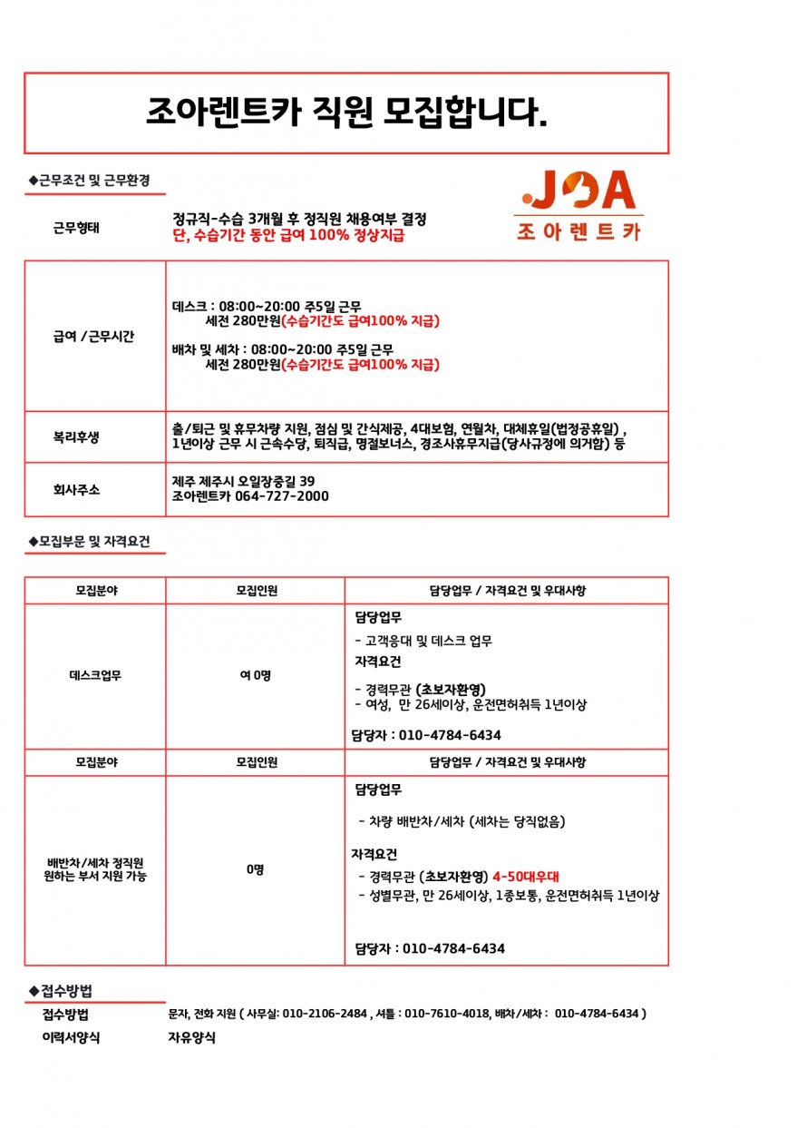조아렌트카 정직원 모집합니다. 출퇴근/휴무 차량 지원 페이지 정보 작성자 jOOOOa 작성일24-12-28 10:11 조회3,105회 연락처 010-4784-6434 급여 월급 : 280만원 관련링크 본문 주소 : 제주특별자치도 제주시 오일장중길 39 조아렌트카 이전글 다음글 목록