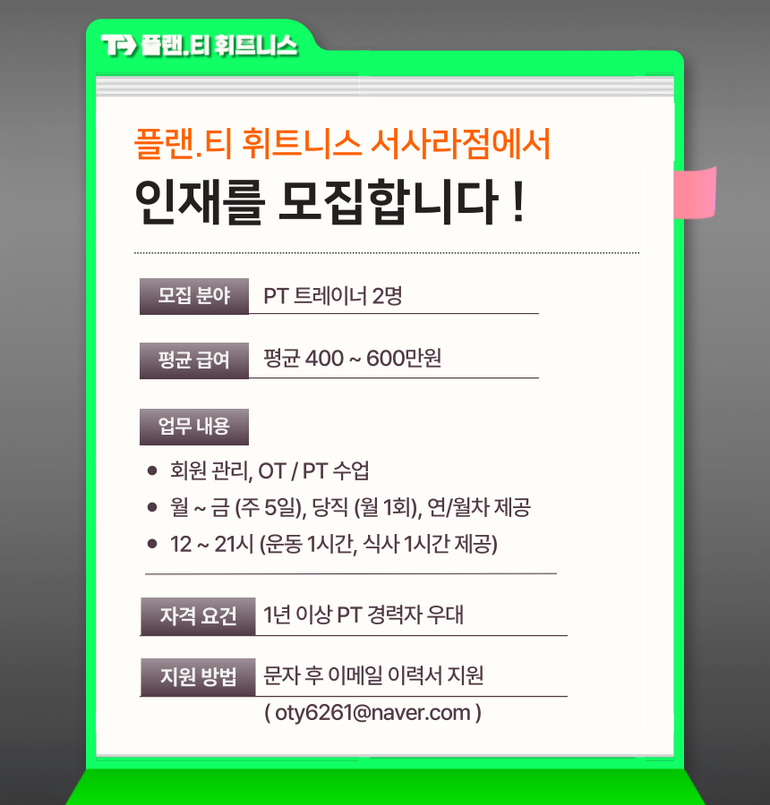 신규 오픈한 플랜.티 휘트니스 서사라점에서 인재를 모집합니다 !