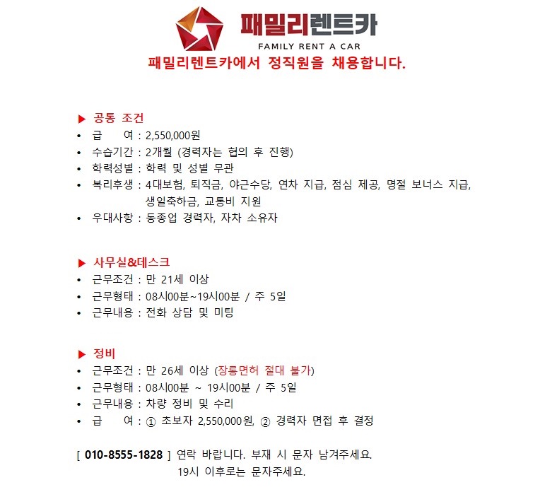 패밀리렌트카 사무실&데스크 정직원 구인 페이지 정보 작성자 패OOOO카 작성일25-07-30 08:36 조회1,935회 연락처 010-8555-1828 급여 월급 : 255만 관련링크 본문 연락주세요 주소 : 제주특별자치도 제주시 제성1길 67 이전글 다음글 목록
