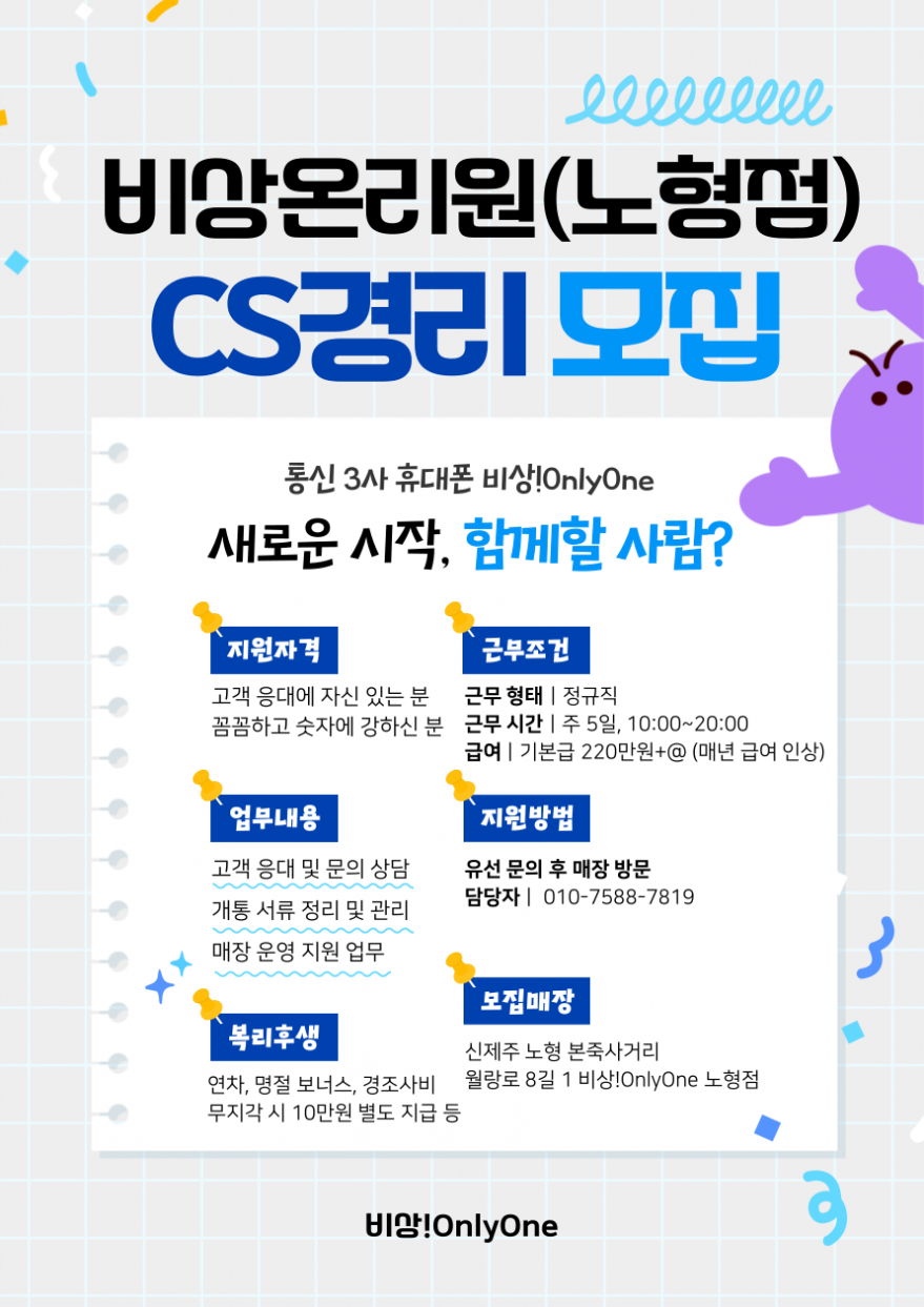 휴대폰 매장 비상!OnlyOne(노형점) CS 경리 구인합니다!! 페이지 정보 작성자 아O라 작성일26-03-11 11:23 조회33회 연락처 010-7588-7819 급여 월급 : 220만원 관련링크 본문 - 주소 : 제주특별자치도 제주시 월랑로8길 1 아란야플라자 이전글 다음글 목록