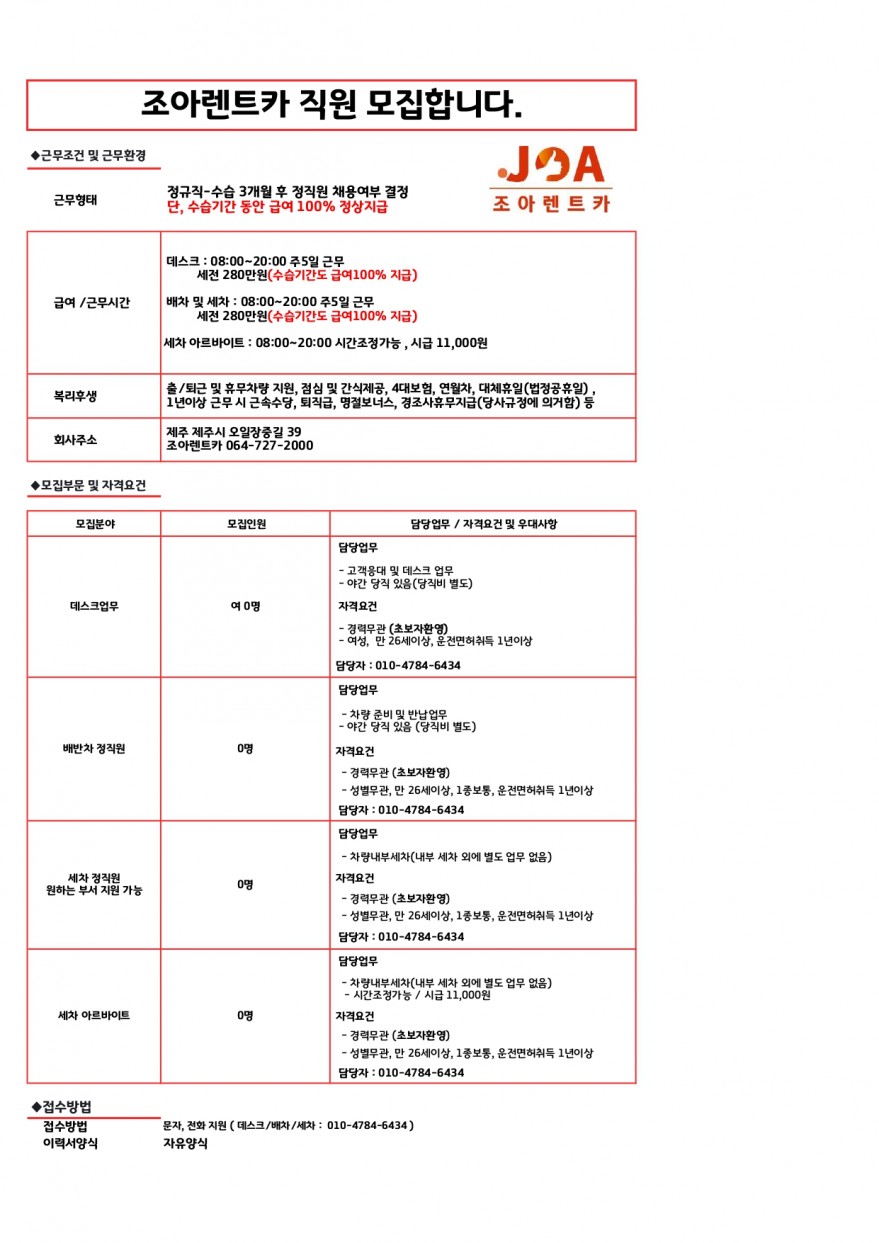 ✿˘◡˘✿ ㈜조아렌트카 데스크/배반차/세차(아르바이트포함) 정직원 모집합니다. 출퇴근/휴무 차량 지원 페이지 정보 작성자 jOOOOOt 작성일25-07-26 12:58 조회2,044회 연락처 010-4784-6434 급여 월급 : 280만원 관련링크 본문 주소 : 제주특별자치도 제주시 오일장중길 39 조아렌트카 이전글 다음글 목록