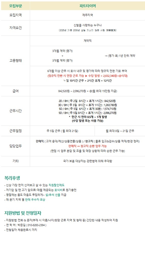 ABC마트 GS 신제주연동점 판매직,창고직 채용 페이지 정보 작성자 꽃OOO돌 작성일25-07-26 11:10 조회2,435회 연락처 010-9814-2678 급여 월급 : 2090000 관련링크 본문 .. 주소 : 제주특별자치도 제주시 신광로 58 삼덕프라자 1층 ABC마트 이전글 다음글 목록