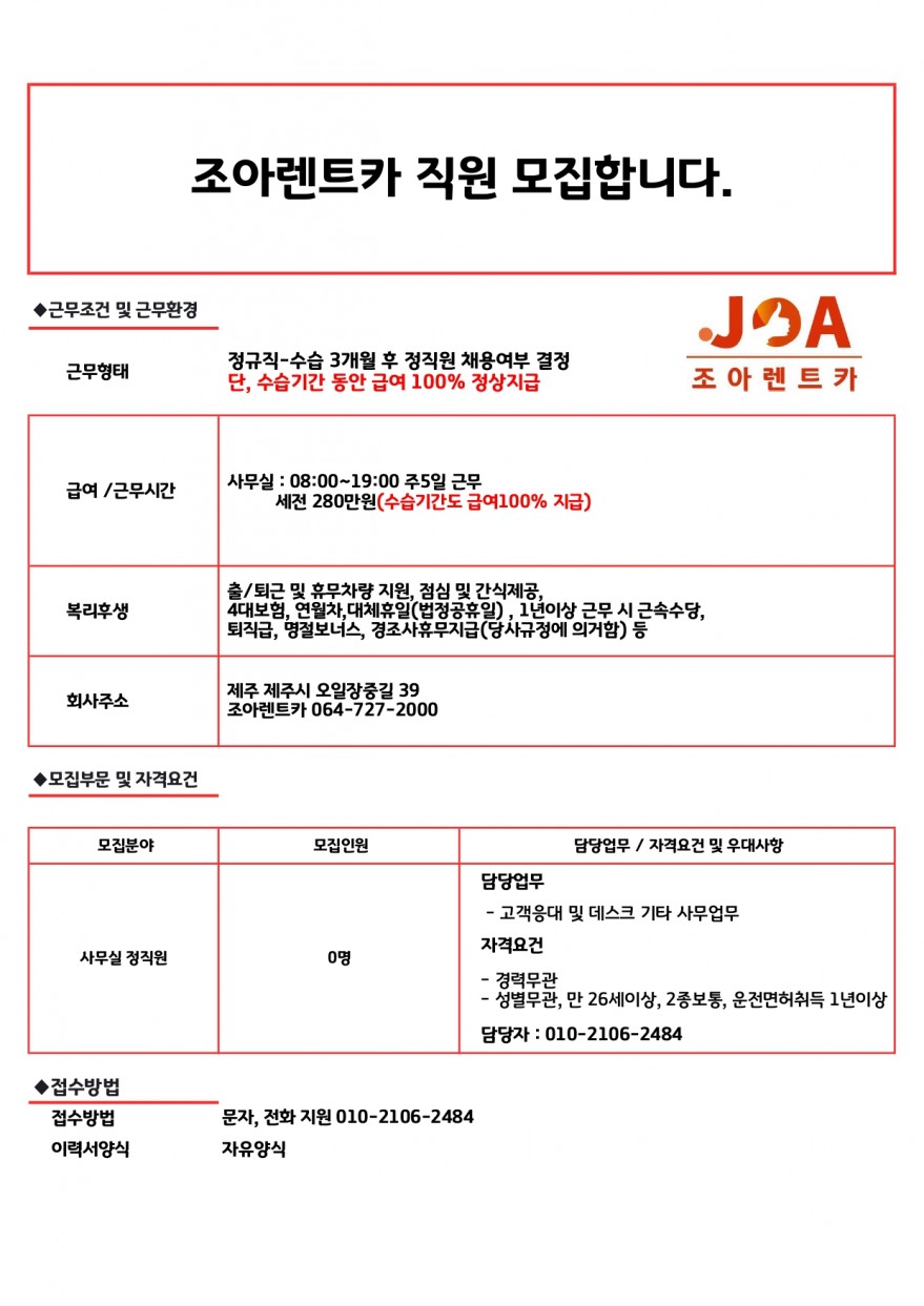 조아렌트카 정직원 모집합니다. 출퇴근/휴무 차량 지원 페이지 정보 작성자 jOOOOa 작성일24-11-26 09:06 조회2,839회 연락처 010-2106-2484 급여 월급 : 280만원 관련링크 본문 주소 : 제주특별자치도 제주시 오일장중길 39 조아렌트카 이전글 다음글 목록