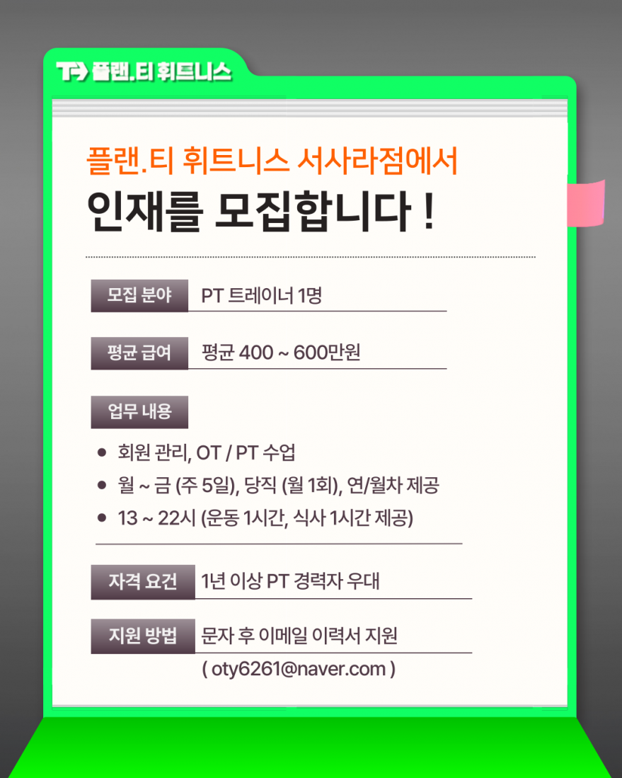 ❤️ 플랜티 휘트니스 서사라점에서 인재를 모집합니다 ❤️ 페이지 정보 작성자 플OOOOO점 작성일25-07-14 20:23 조회2,961회 연락처 010-3254-9006 급여 협의 : 400 ~ 600만원 관련링크 본문 [플랜.티 휘트니스 서사라점] 에서 퍼스널 트레이너를 모집합니다 ! 주소 : 제주특별자치도 제주시 서사로 67 플랜티 휘트니스 서사라점 이전글 다음글 목록