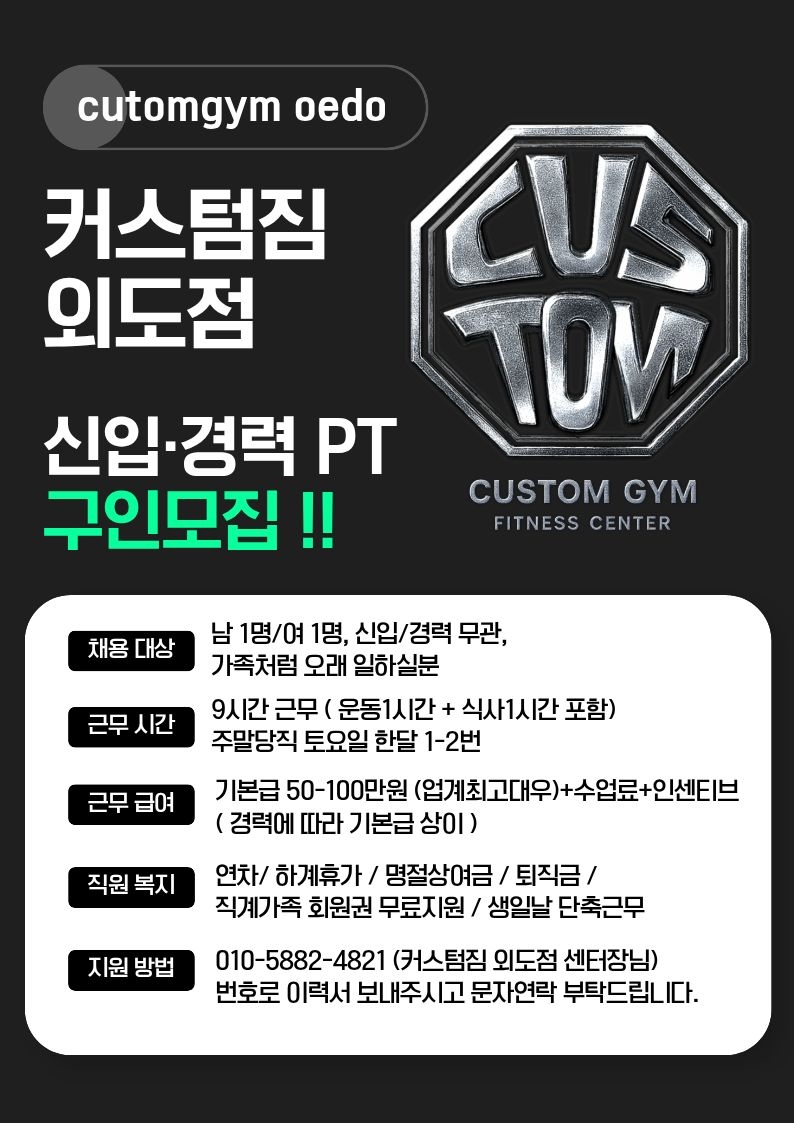 [커스텀짐 외도점] 신입/경력 PT 트레이너 모집 (남여 각 1명)