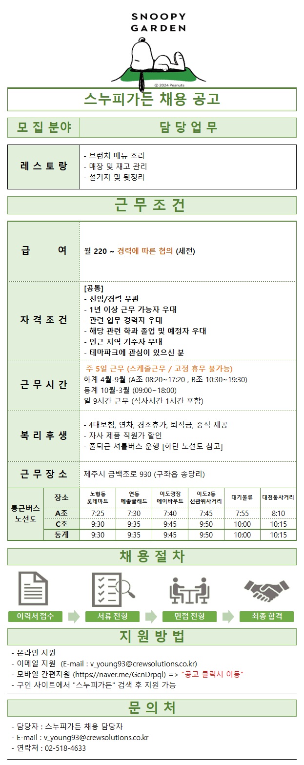 [스누피가든] 스토어(기념품판매) 및 레스토랑(주방,조리,요리) 직원 모집