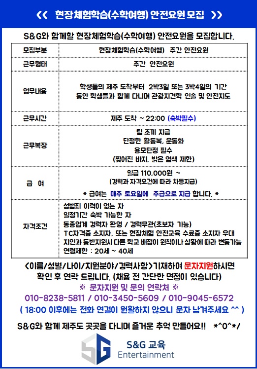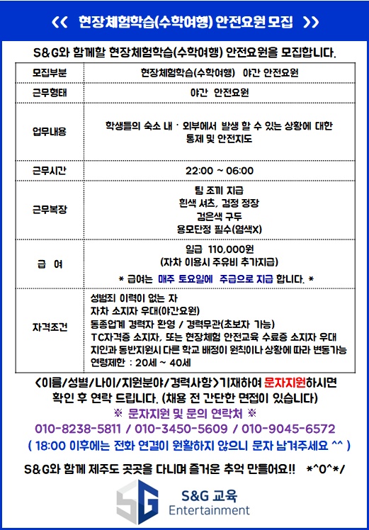 10월 21일주차 28일주차 수학여행 안전요원 모집합니다!!