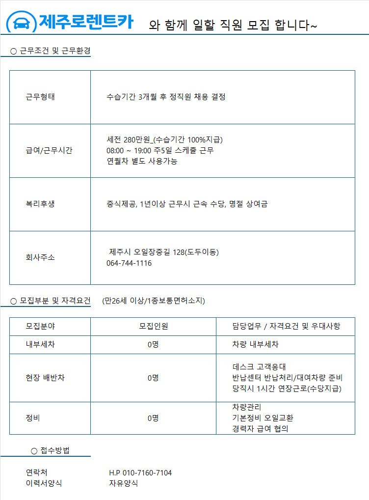 제주로렌트카 직원 모집 페이지 정보 작성자 jOOOOOOOOt 작성일24-09-17 13:10 조회3,610회 연락처 010-7160-7104 급여 월급 : 280만원 관련링크 본문 메세지 부탁드립니다. 주소 : 제주특별자치도 제주시 오일장중길 128 (도두이동) 이전글 다음글 목록
