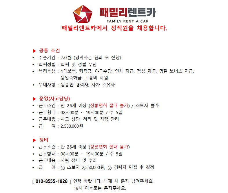 패밀리렌트카 정직원 채용 페이지 정보 작성자 패OOOO카 작성일25-06-12 09:18 조회2,324회 연락처 010-8555-1828 급여 월급 : 255만 관련링크 본문 연락주세요 주소 : 제주특별자치도 제주시 제성1길 67 이전글 다음글 목록