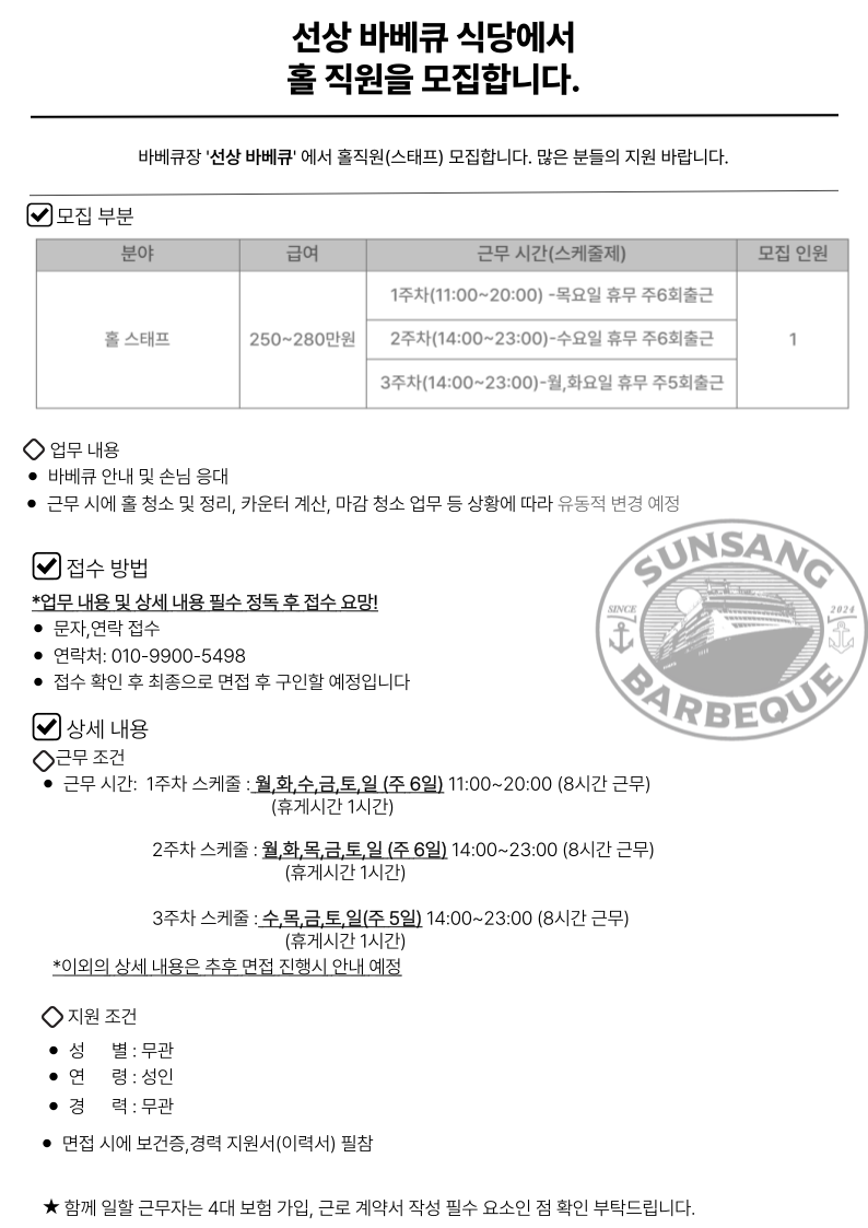 [신규오픈] 선상바베큐 바베큐장에서 홀 스태프를 모집합니다!