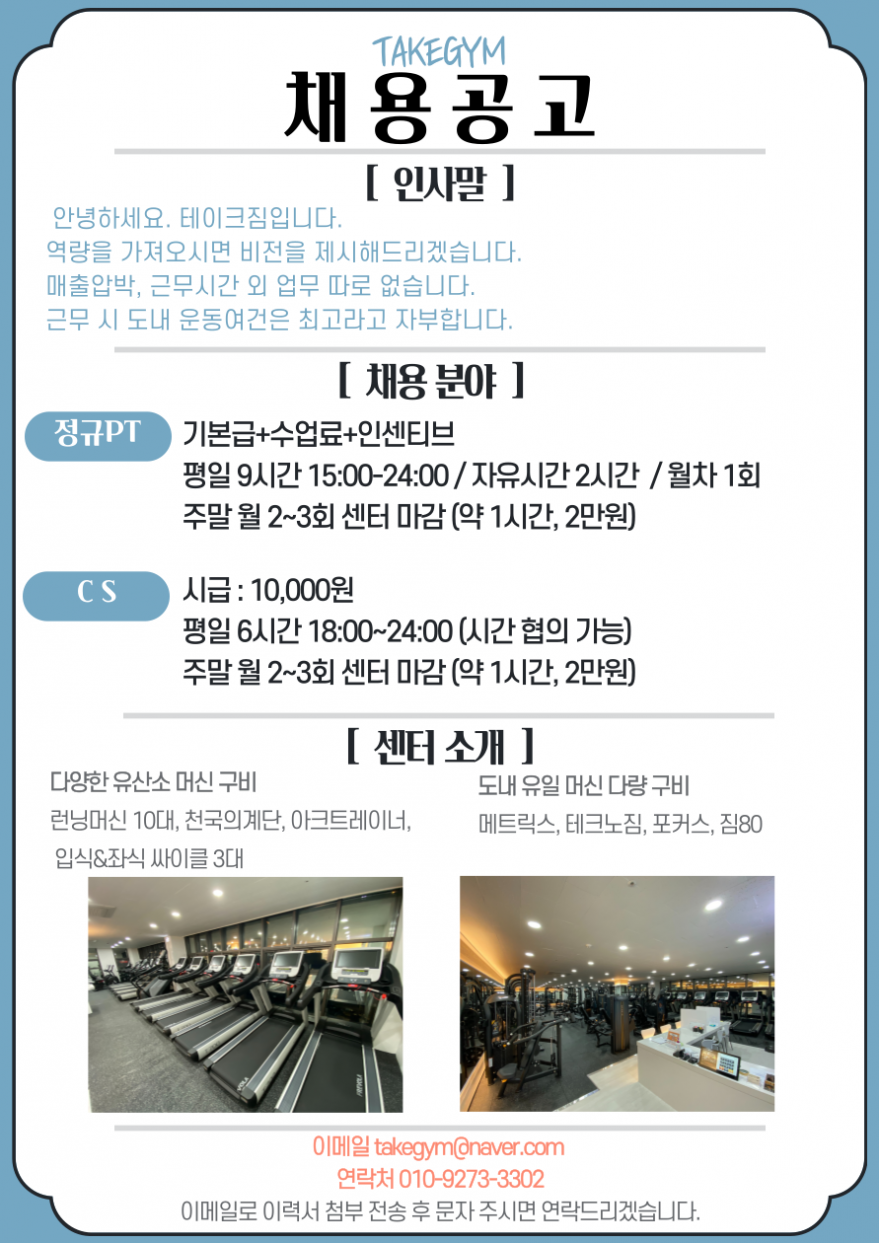 노형 테이크짐 저녁 알바, 트레이너 구합니다 페이지 정보 작성자 테OO짐 작성일24-09-03 15:54 조회4,086회 연락처 010-9273-3302 급여 시급 : 10000 관련링크 본문 . 주소 : 제주특별자치도 제주시 노연로 43 3층 이전글 다음글 목록
