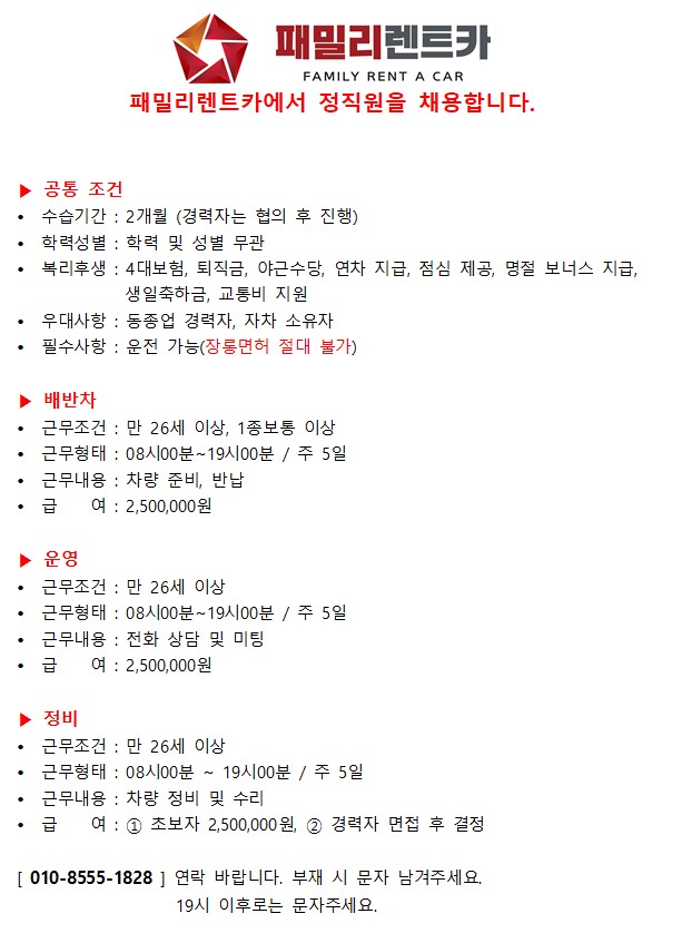 패밀리렌트카 파트별 직원 구인 페이지 정보 작성자 패OOOO카 작성일24-09-01 13:59 조회3,570회 연락처 010-8555-1828 급여 월급 : 250만 관련링크 본문 연락주세요. 주소 : 제주특별자치도 제주시 제성1길 67 이전글 다음글 목록