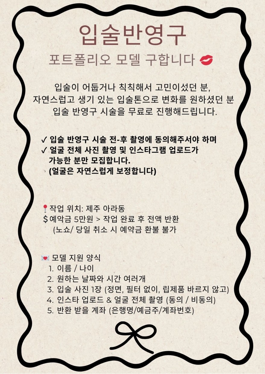 ❤️아라동❤️입술반영구 모델 모집❤️ 페이지 정보 작성자 겨리 작성일25-05-30 12:14 조회2,511회 연락처 010-2230-6689 급여 협의 : 0 관련링크 본문 작업사진은 인스타 @gonggan__beauty 지원양식 작성해서 문자로 부탁드려요~ 주소 : 제주시 인다5길 11-8 이전글 다음글 목록