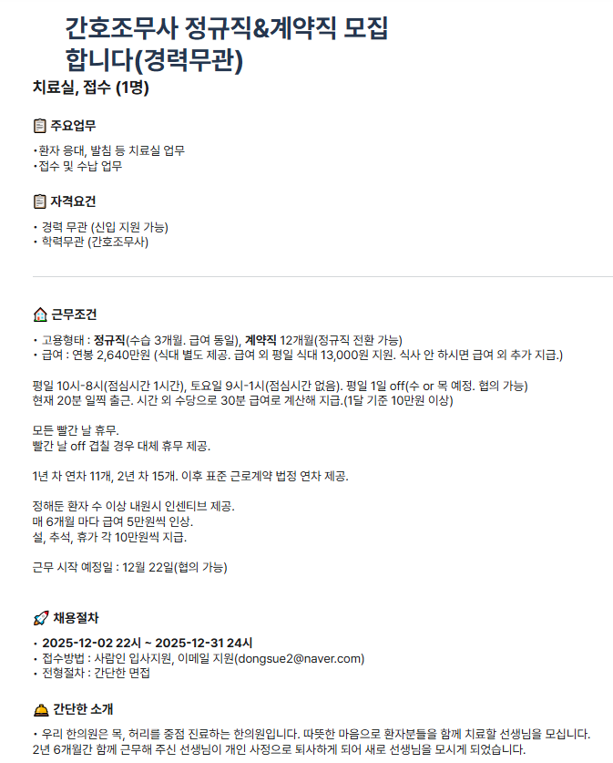 제주 이도한의원 간호조무사 선생님 모십니다. 페이지 정보 작성자 이O이 작성일25-12-09 15:59 조회148회 연락처 010-5604-0509 급여 월급 : 2200000 관련링크 본문 안녕하세요. 제주 이도한의원에서 간호조무사 선생님을 모십니다. 주소 : 제주특별자치도 제주시 승천로 81 2층 이전글 다음글 목록