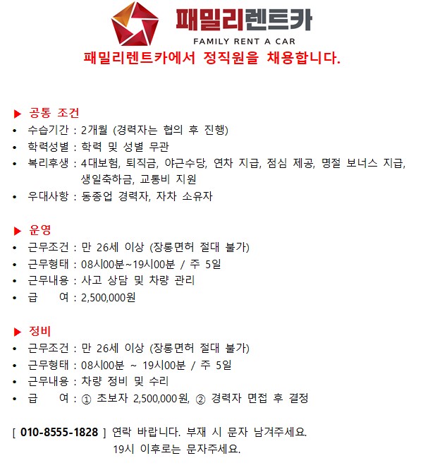 패밀리렌트카 운영팀&정비팀 구인 페이지 정보 작성자 패OOOO카 작성일24-08-14 13:21 조회3,620회 연락처 010-8555-1828 급여 월급 : 250만 관련링크 본문 연락주세요. 주소 : 제주특별자치도 제주시 제성1길 67 패밀리렌트카 이전글 다음글 목록