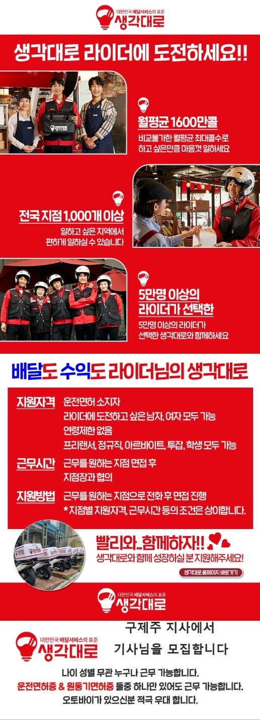 ※ 배달 경력이 없으셔도 가능합니다. (충분히 벌어 가실 수 있도록 교육지원 해 드립니다)