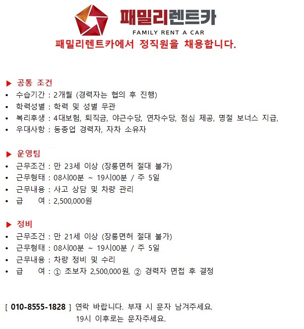 제주 패밀리렌트카 운영, 정비파트 정직원 구합니다. 페이지 정보 작성자 패OOOO카 작성일24-08-12 18:37 조회3,846회 연락처 010-8555-1828 급여 월급 : 250만 관련링크 본문 연락 주세요 :) 주소 : 제주특별자치도 제주시 제성1길 67 이전글 다음글 목록