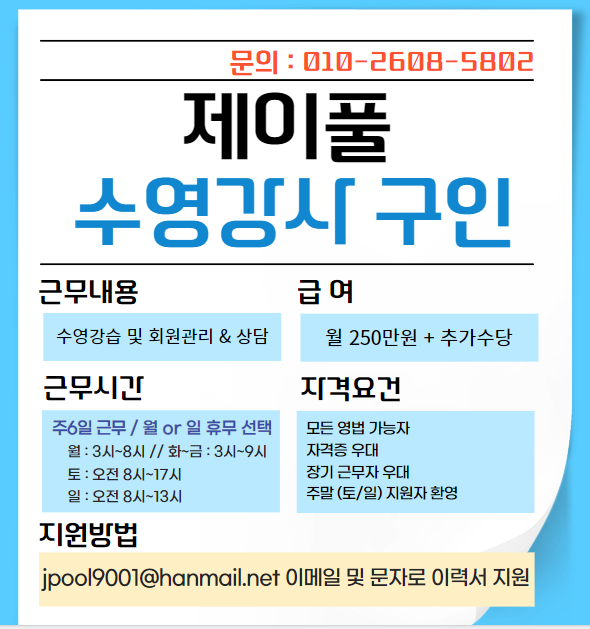 어린이 수영장 <제이풀> 수영강사 정직원 채용공고 페이지 정보 작성자 스O프 작성일24-08-09 10:12 조회3,686회 연락처 010-2608-5802 급여 월급 : 250만원+@ 관련링크 본문 어린이 수영장 제이풀입니다.아이들과 즐겁게 수영강습 해주실 선생님을 구인합니다아이들에게 수영강습을 하고 싶은 젊은 청년들도 지원 가능합니다.영법 및 강습 교육을 통해 교육기간 이수 후 정직원 채용이 가능합니다. 주소 : 제주특별자치도 제주시 연화남길 22 이전글 다음글 목록