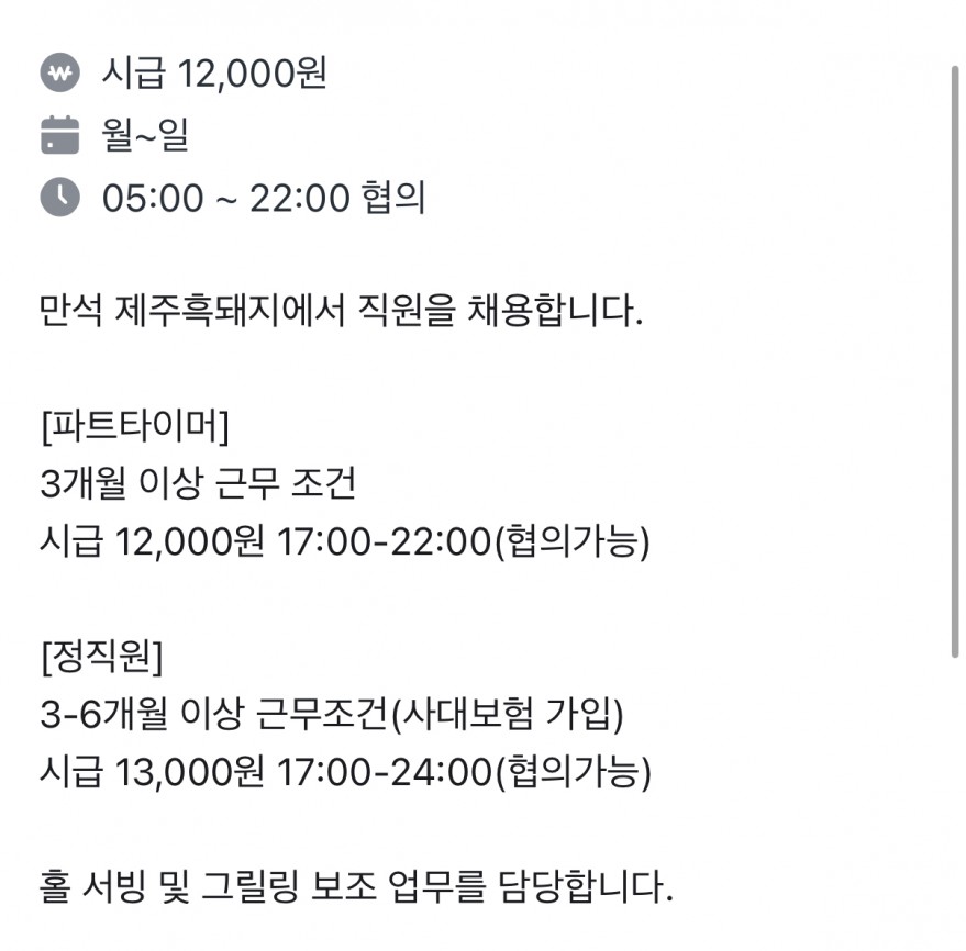 만석 제주흑돼지 홀/주방 직원 및 파트타이머 구인 페이지 정보 작성자 고O진 작성일25-05-08 14:39 조회3,404회 연락처 010-5713-0736 급여 시급 : 13000 관련링크 본문 이미지 파일 참조 주소 : 제주시 원노형 3길 4-6 이전글 다음글 목록