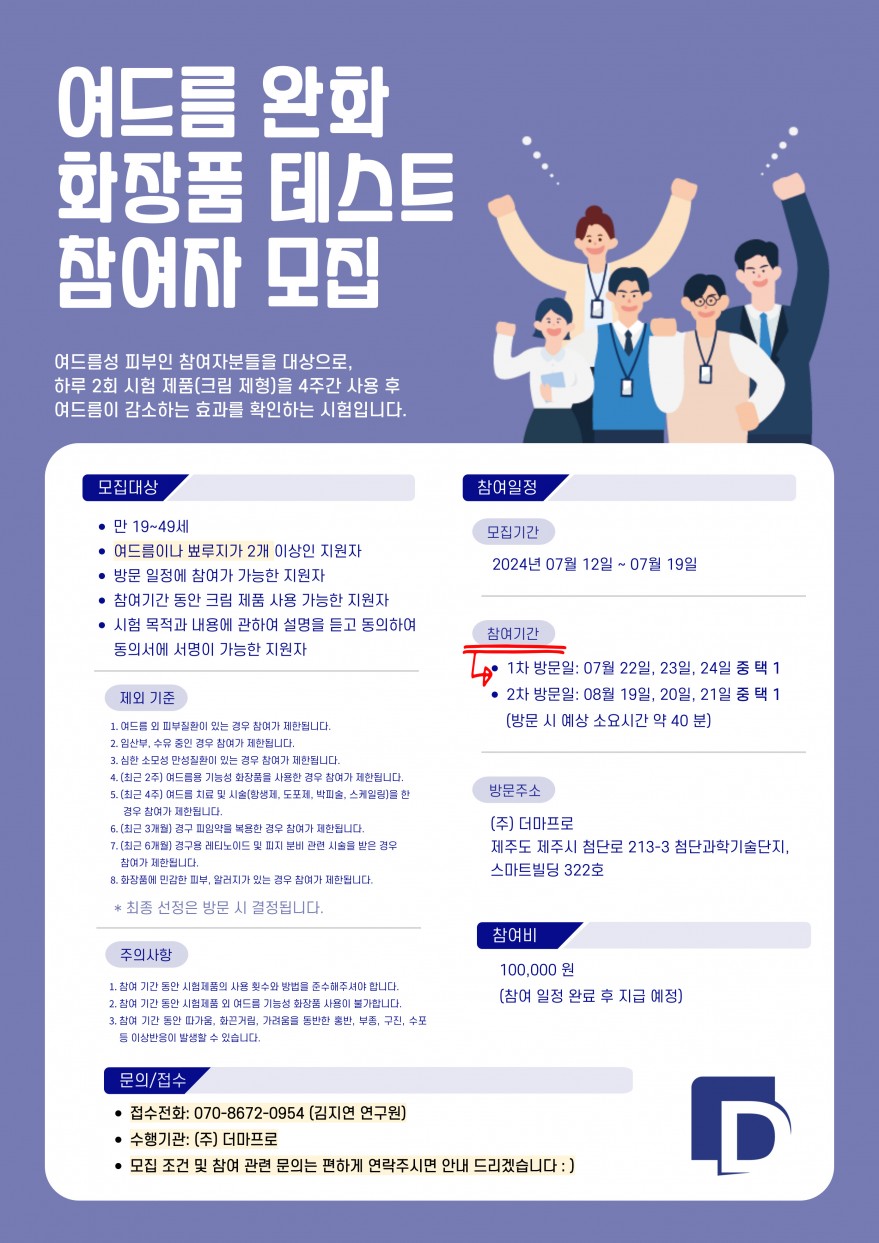 • 카카오톡 문의: [더마제주] 화장품 테스트 지원자 접수 https://open.kakao.com/o/s1I2l1Cg