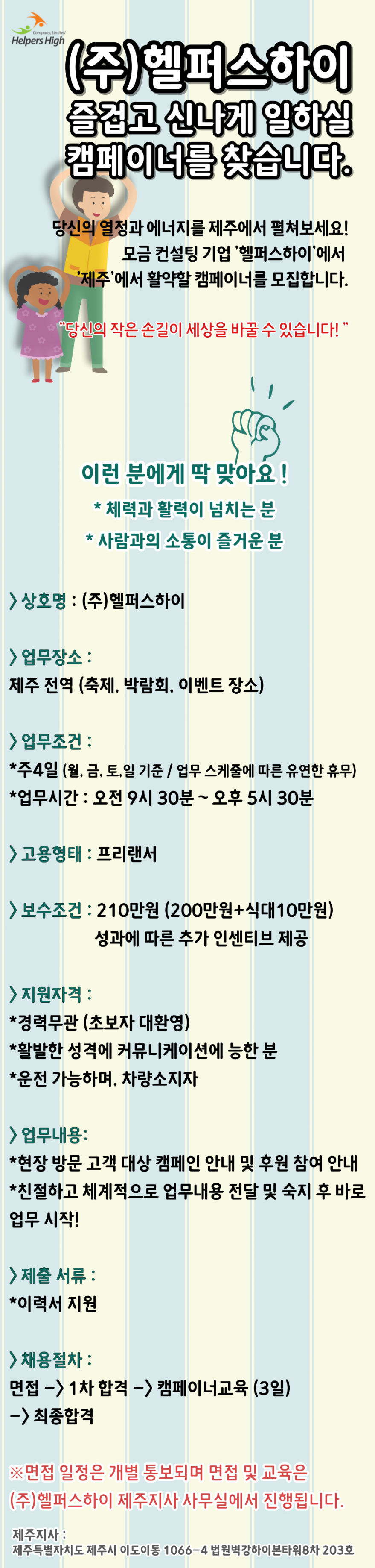 (주4일제) 제주 캠페이너 채용/ 즐겁고 신나게 일하실 분을 찾습니다 페이지 정보 작성자 hOOOOOOOOOh 작성일25-04-21 11:31 조회3,253회 연락처 010-2614-9020 급여 월급 : 210000 관련링크 본문 *지원 방법 0 10-2614-9020 (이름, 나이, 사는곳 작성하여 문자 지원 부탁드립니다.) 주소 : 제주특별자치도 제주시 이도이동 1066-4 이전글 다음글 목록