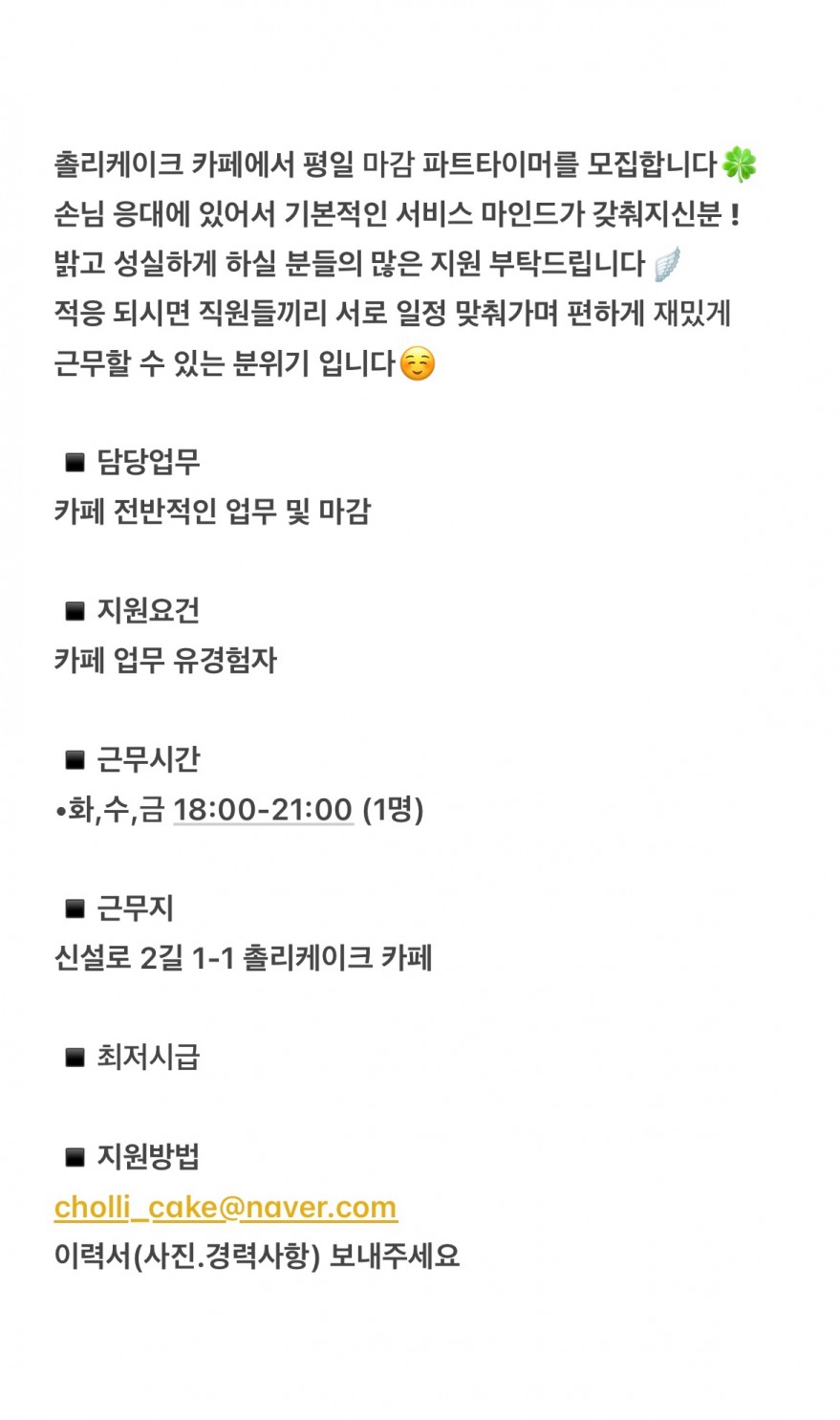 카페 평일 마감 파트타이머 모집합니다 ~~! 페이지 정보 작성자 cOOOOe 작성일25-04-07 17:51 조회2,937회 연락처 010-3910-0327 급여 시급 : 10030 관련링크 본문 주소 : 신설로2길1-1 이전글 다음글 목록