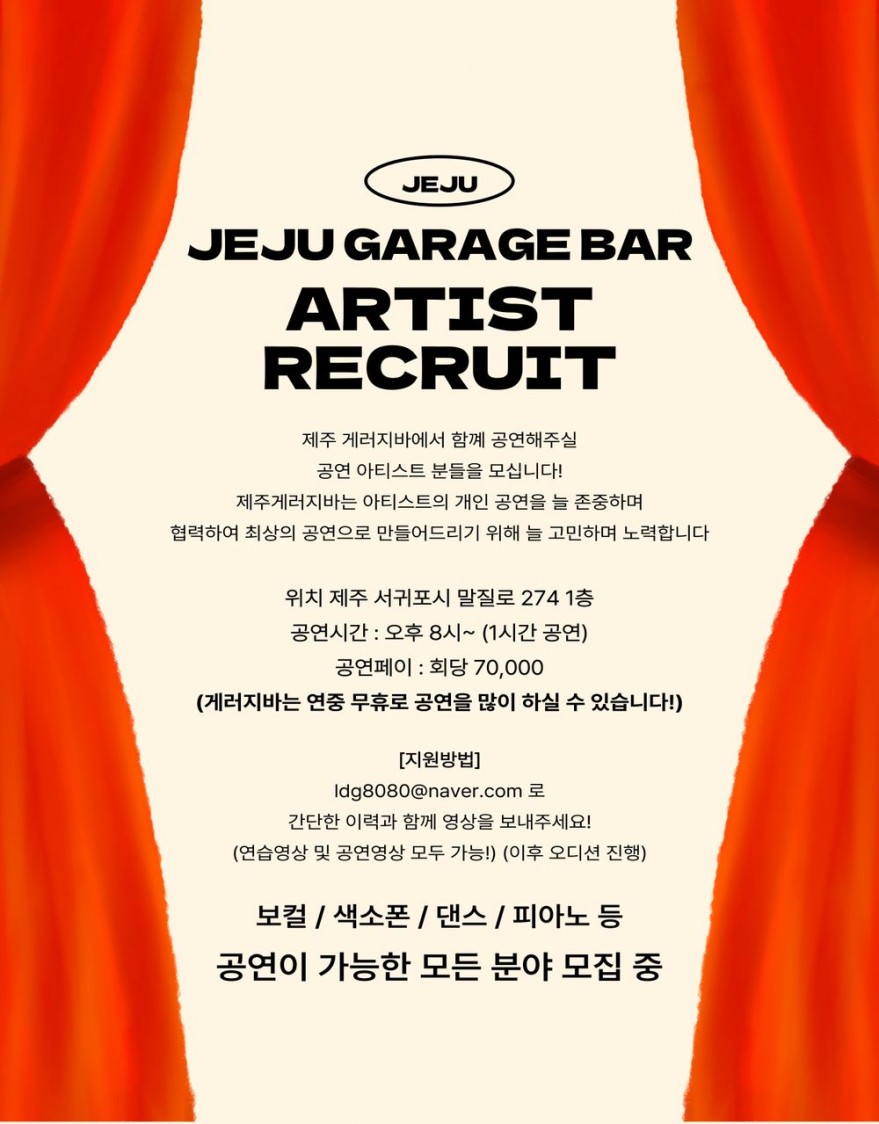 강정항 바로 앞에 위치한 제주게러지바에서 공연하실 아티스트분들을 모십니다.