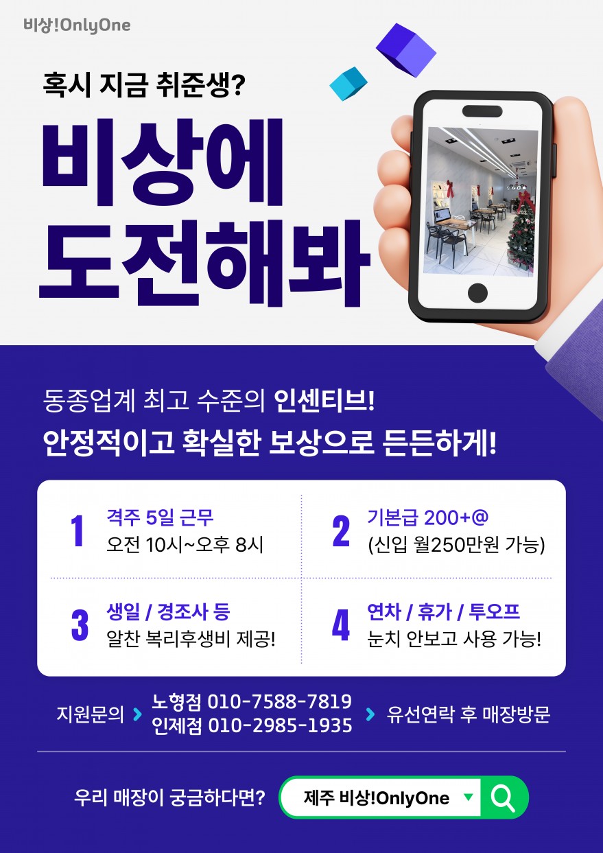 휴대폰매장⭐️비상!OnlyOne⭐️남녀직원모집!! 페이지 정보 작성자 일OO손 작성일26-01-29 18:54 조회139회 연락처 010-7588-7819 급여 월급 : 250만원 이상 관련링크 본문 - 주소 : 제주 제주시 월랑로 8길 1 이전글 다음글 목록