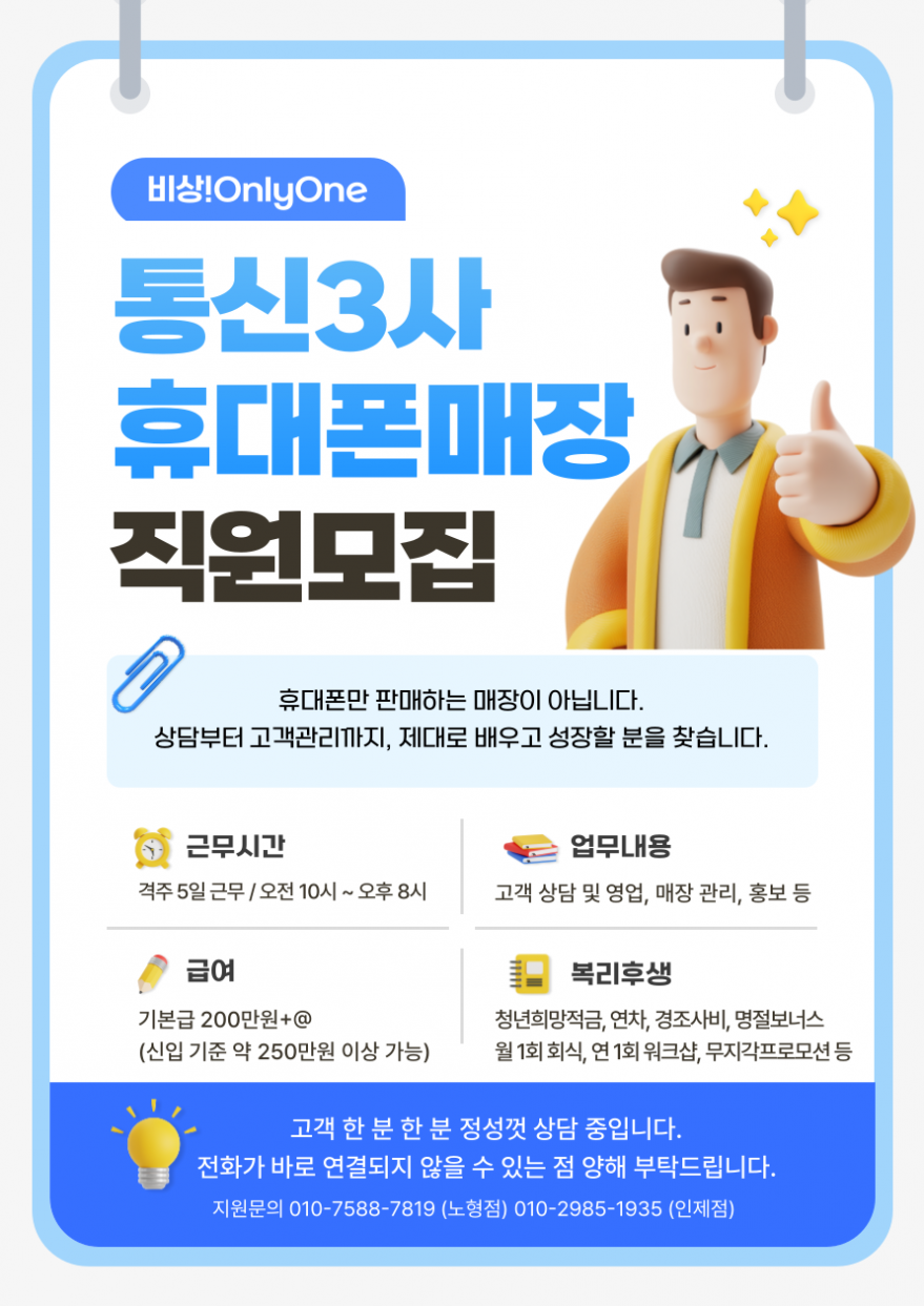 휴대폰 매장 직원 급구!!!!!! 면접 때 급여 듣고 놀라지 마세요!!! 페이지 정보 작성자 일OO손 작성일26-03-07 16:57 조회172회 연락처 010-7588-7819 급여 월급 : 250만원 이상 관련링크 본문 - 주소 : 제주특별자치도 제주시 월랑로8길 1 아란야플라자 이전글 다음글 목록