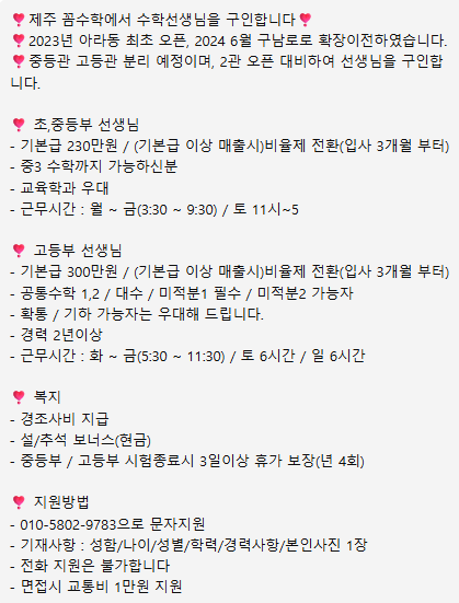 수학 학원에서 선생님을 모십니다. 페이지 정보 작성자 김환 작성일25-09-24 19:49 조회2,487회 연락처 010-5802-9783 급여 협의 : N 관련링크 본문 주소 : 제주특별자치도 제주시 구남로7길 13-7 3층 이전글 다음글 목록