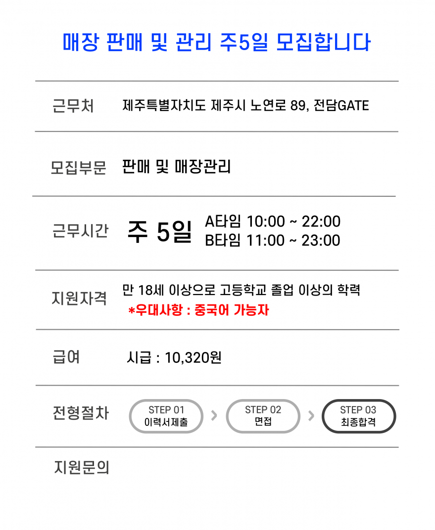★★★세상에서 제일 쉬운 판매직 직원을 모집합니다★★★ 페이지 정보 작성자 곽O식 작성일25-12-04 17:48 조회280회 연락처 010-8331-6509 급여 시급 : 10,320 관련링크 본문 ■ 주업무 : 고객이 물건 선택하면 결제 후 봉투에 담아드리기.외워야 할 내용 거의 없음.■ 근무지 : 연동 주소 : 제주특별자치도 제주시 노연로 89 1층 전담GATE 이전글 다음글 목록