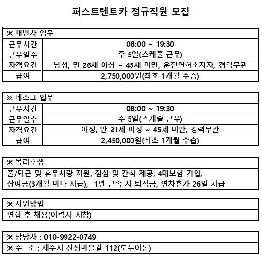 퍼스트렌트카_배반차_및_데스크_직원모집 페이지 정보 작성자 강O성 작성일25-09-10 12:29 조회1,963회 연락처 010-9922-0749 급여 월급 : 275만원 관련링크 본문 연락바랍니다. 주소 : 제주특별자치도 제주시 신성마을길 112 1층 이전글 다음글 목록
