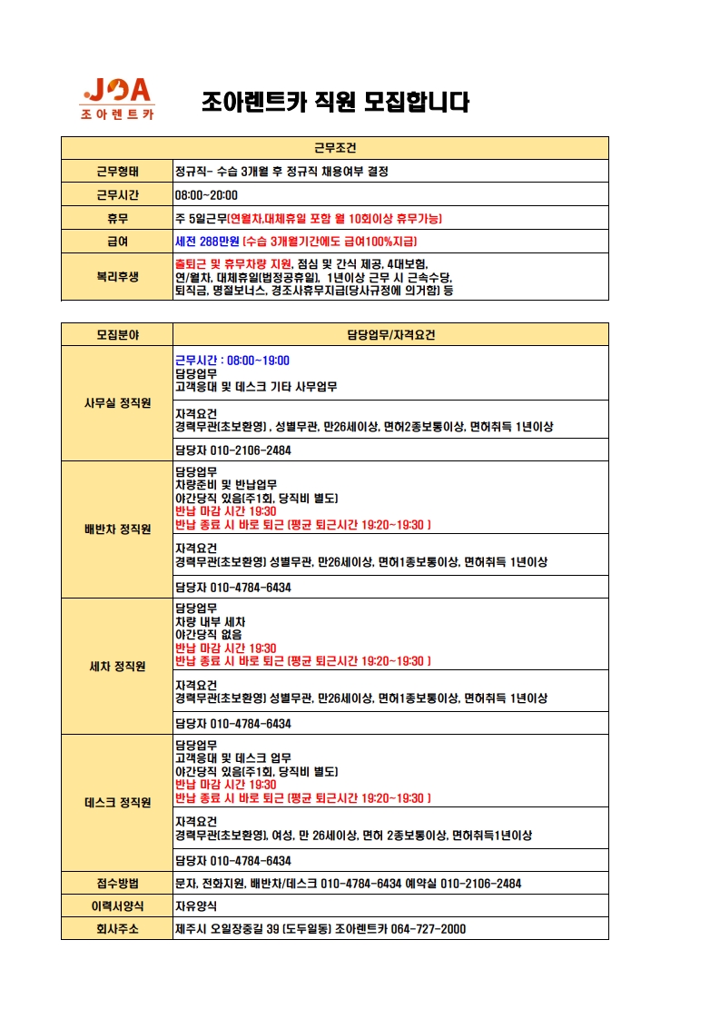 ⭐조아렌트카⭐예약실,배차,세차⭐출퇴근,휴무차량지원⭐ 페이지 정보 작성자 jOOOOa 작성일26-02-26 09:41 조회244회 연락처 010-4784-6434 급여 월급 : 288만원 관련링크 본문 주소 : 제주특별자치도 제주시 오일장중길 39 이전글 다음글 목록