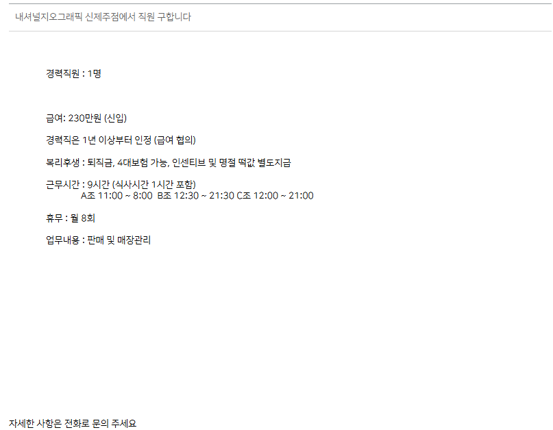 ♡♥♡♥내셔널지오그래픽신제주점직원구합니다♡♥♡♥ 페이지 정보 작성자 내O널 작성일25-09-08 13:01 조회2,836회 연락처 010-9666-3440 급여 월급 : 230만원 관련링크 본문 . 주소 : 제주특별자치도 제주시 신광로 43-1 1층 이전글 다음글 목록