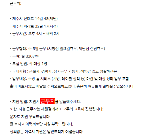 곱분이곱창시청&제원직원모집 페이지 정보 작성자 단잠 작성일25-09-07 12:16 조회2,347회 연락처 010-7749-5531 급여 월급 : 3300000 관련링크 본문 - 주소 : 제주특별자치도 제주시 서광로32길 17 이전글 다음글 목록