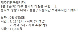 9월9일_하루_근무자_구인합니다 페이지 정보 작성자 제OOO복 작성일25-09-07 12:37 조회2,514회 연락처 010-5685-0355 급여 시급 : 11000 관련링크 본문 제주김만복 주소 : 제주특별자치도 제주시 오라로 41 제주김만복 본점 이전글 다음글 목록