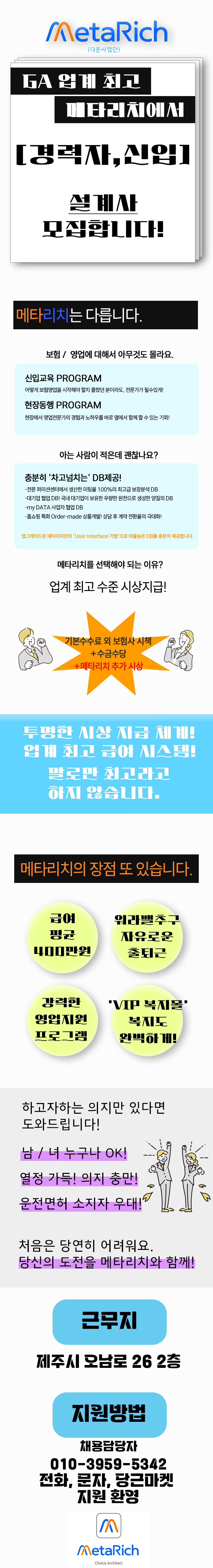 높은 수익, 자유로운 시간 메타리치 신입/경력자 모집 페이지 정보 작성자 메OO온 작성일25-03-06 15:33 조회2,455회 연락처 010-3959-5342 급여 월급 : 4000000 관련링크 본문 남녀노소! 누구나 다 지원 가능합니다. 직무에 대해서 궁금증이 있으시다면 직무 설명회도 가능합니다. 문자 및 전화 카카오톡으로도 지원 가능하오니편하게 연락 바랍니다. 주소 : 제주특별자치도 제주시 오남로 26 2층 메타리치 이전글 다음글 목록