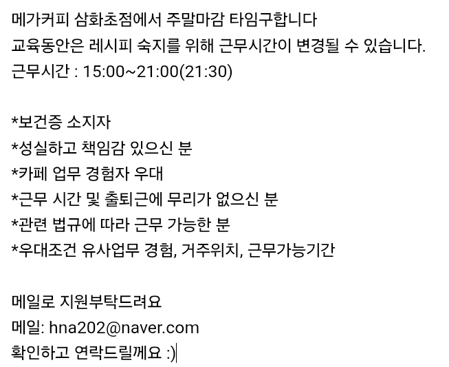 메가삼화초점마감모집합니다 페이지 정보 작성자 돌굴 작성일25-12-28 10:04 조회466회 연락처 010-7170-3336 급여 시급 : 10030 관련링크 본문 메가삼화초점주말마감모집합니다. 주소 : 제주시 화삼로19 삼화빌딩1층 메가커피 삼화초점 이전글 다음글 목록