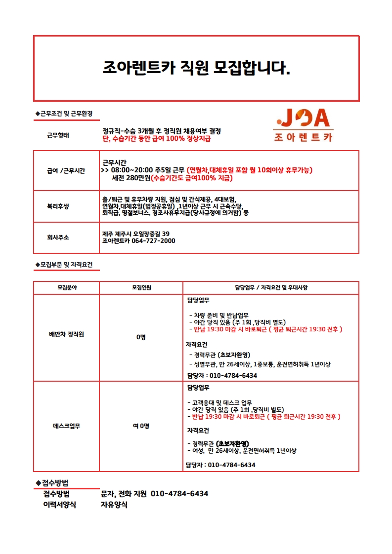 ໒(◉ᴥ◉)७ ㈜조아렌트카 데스크/배차 정직원 모집!! 출퇴근/휴무 차량 지원 페이지 정보 작성자 jOOOOOt 작성일25-08-22 12:08 조회3,047회 연락처 010-4784-6434 급여 월급 : 280만원 관련링크 본문 주소 : 제주특별자치도 제주시 오일장중길 39 조아렌트카 이전글 다음글 목록