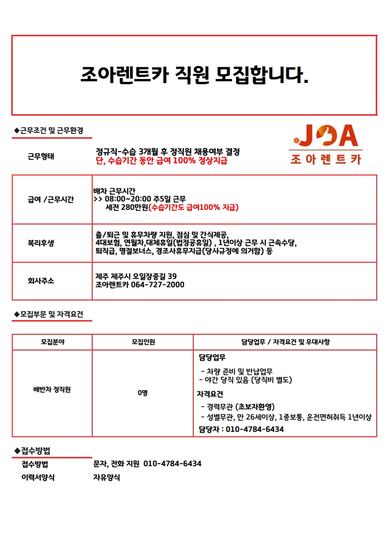 へ( ̄∇ ̄へ) ㈜조아렌트카 배차 정직원 모집합니다. 출퇴근/휴무 차량 지원 페이지 정보 작성자 쎄OO어 작성일25-08-19 17:04 조회2,941회 연락처 010-4784-6434 급여 월급 : 280만원 관련링크 본문 주소 : 제주특별자치도 제주시 오일장중길 39 조아렌트카 이전글 다음글 목록