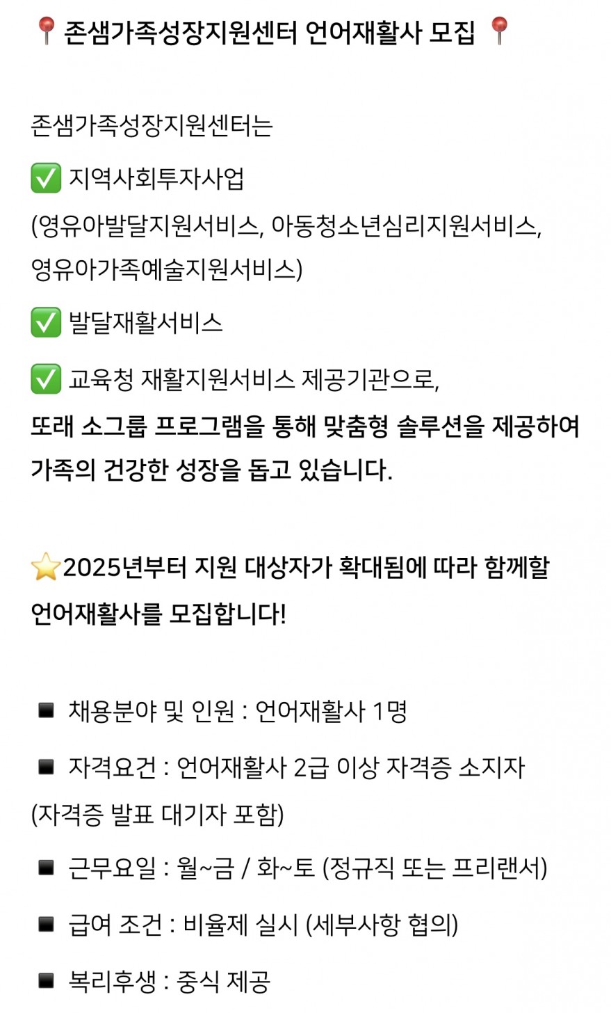 --> 2025년부터 지원 대상자가 확대됨에 따라 함께할 언어재활사를 모집합니다!