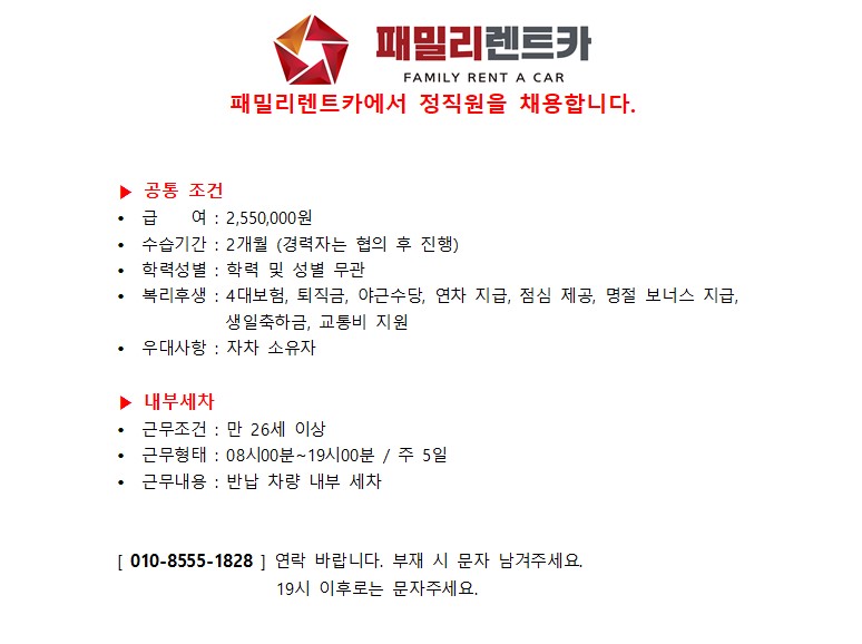 패밀리렌트카 내부세차 직원 채용 페이지 정보 작성자 패OOOO카 작성일25-08-18 18:49 조회2,730회 연락처 010-8555-1828 급여 월급 : 255만 관련링크 본문 연락주세요 주소 : 제주특별자치도 제주시 제성1길 67 이전글 다음글 목록