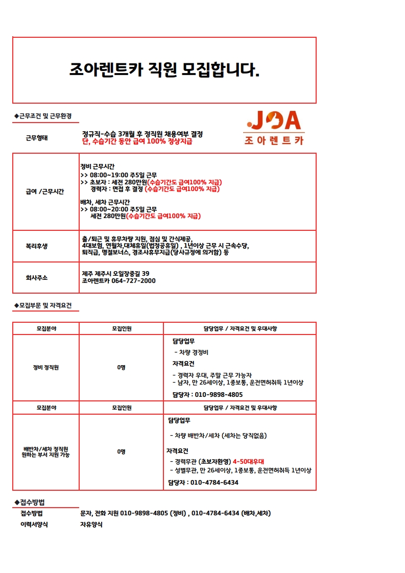 조아렌트카에서 직원을 모집합니다,출퇴근/휴무차량지원 페이지 정보 작성자 jOOOOa 작성일25-02-06 14:50 조회2,014회 연락처 010-4784-6434 급여 월급 : 280만원 관련링크 본문 . 주소 : 제주특별자치도 제주시 오일장중길 39 조아렌트카 이전글 다음글 목록