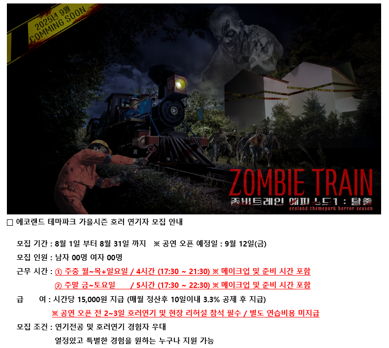■에코랜드 테마파크 가을시즌 호러 연기자 모집 안내 페이지 정보 작성자 고O준 작성일25-08-14 14:24 조회1,926회 연락처 010-9171-1087 급여 시급 : 15,000 관련링크 본문 ▪︎채용 담당.- 에코랜드 콘텐츠팀 ▪︎아래 연락처로 지원 문자 바랍니다.- 김동규과장 : o1o - 9171 - 1087 주소 : 제주특별자치도 제주시 조천읍 번영로 1278-169 에코랜드테마파크 이전글 다음글 목록