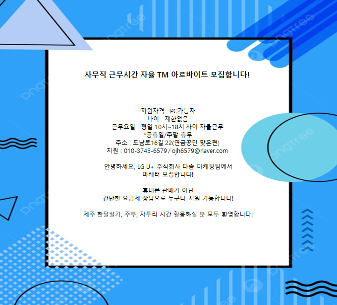 사무직 TM 아르바이트 모집합니다. 페이지 정보 작성자 다OOOO1 작성일25-01-31 12:23 조회2,855회 연락처 010-3745-6579 급여 시급 : 10030 관련링크 본문 멘트 및 방법은 모두 알려드려요! 전화 한통으로 최소 2만원 이상 벌 수 있는 좋은기회입니다! 편히 연락 주세요! 주소 : 제주특별자치도 제주시 도남로16길 22 2층 이전글 다음글 목록