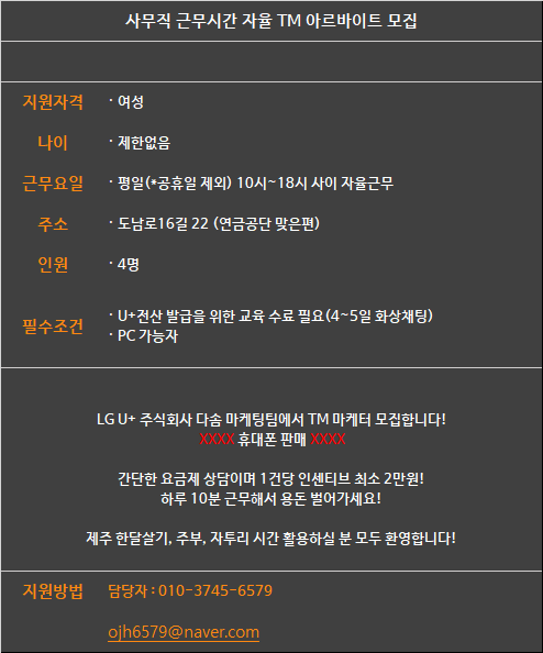 주식회사 다솜 사무직 OB 아르바이트 모집합니다! 페이지 정보 작성자 다OOOO1 작성일25-01-22 17:44 조회3,827회 연락처 010-3745-6579 급여 협의 : 수수료 지급 관련링크 본문 문의사항 편히 연락주세요! 찔러보기/문의사항 모두 환영합니다! 주소 : 제주특별자치도 제주시 도남로16길 22 2층 이전글 다음글 목록